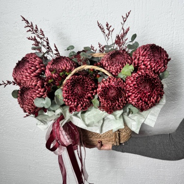 Красивый букет с хризантемами. Покупали с сотрудниками на день рождения начальству. Заказали 5 букетов, сделали даже скидку. Продавец общительный, доставили быстро.
