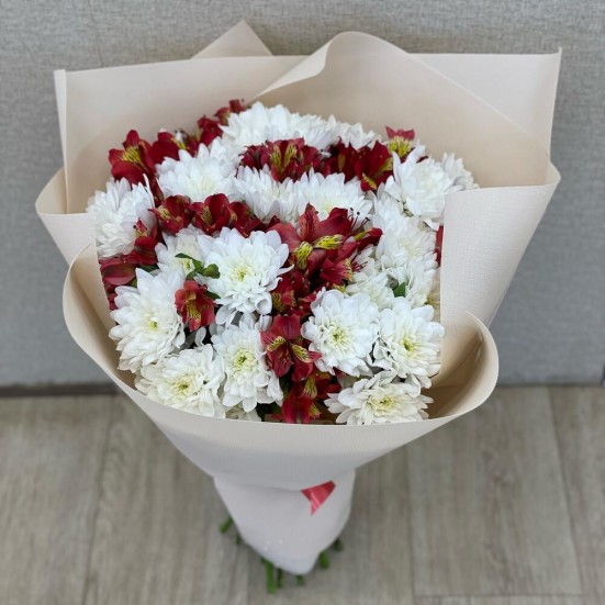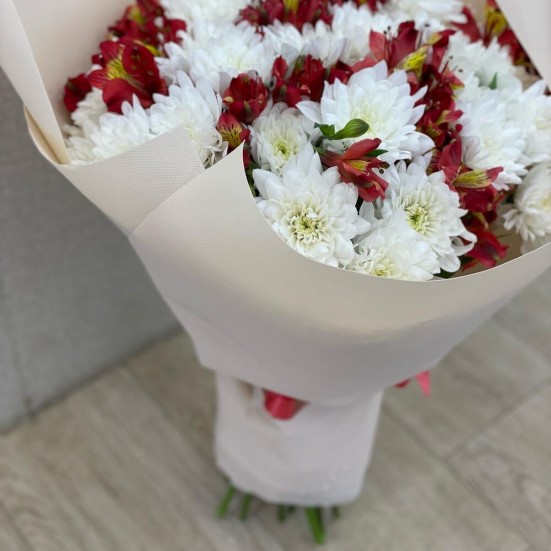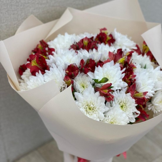 Букет из белых хризантем и альстромерий