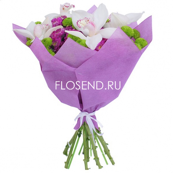 Красивый букет с хризантемами. Покупали с сотрудниками на день рождения начальству. Заказали 5 букетов, сделали даже скидку. Продавец общительный, доставили быстро.
