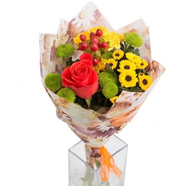 Красивый букет с хризантемами. Покупали с сотрудниками на день рождения начальству. Заказали 5 букетов, сделали даже скидку. Продавец общительный, доставили быстро.