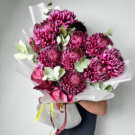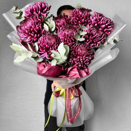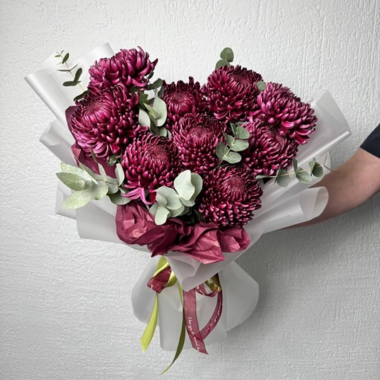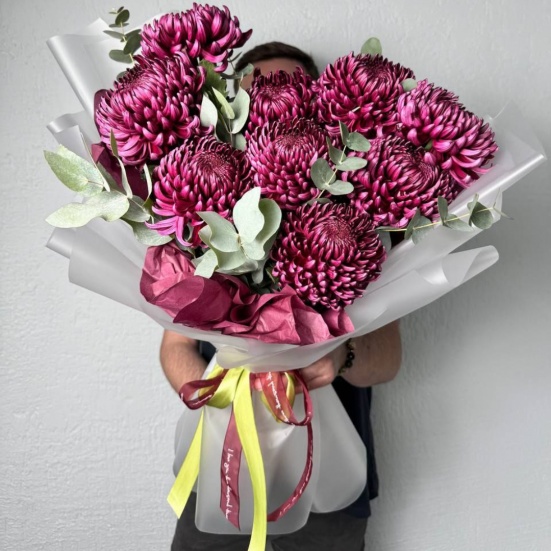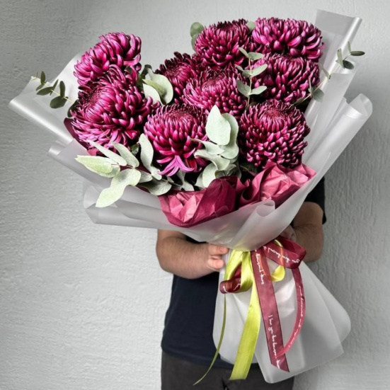 Красивый букет с хризантемами. Покупали с сотрудниками на день рождения начальству. Заказали 5 букетов, сделали даже скидку. Продавец общительный, доставили быстро.